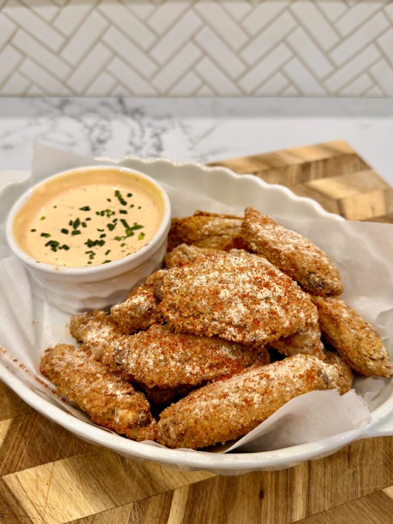 These Air Fried Spicy Ranch Crispy Wings are everything you want in a wing: ultra crispy on the outside, juicy on the inside, and coated in a bold, tangy, slightly spicy ranch seasoning. The wings are tossed in a seasoned flour and cornstarch mixture with a touch of baking powder for that signature crunchy texture, then lightly misted with oil and air fried to golden perfection. Once hot out of the air fryer, they’re finished with a ranch and cayenne blend that hits you with savory, herby, and spicy flavor in every bite.