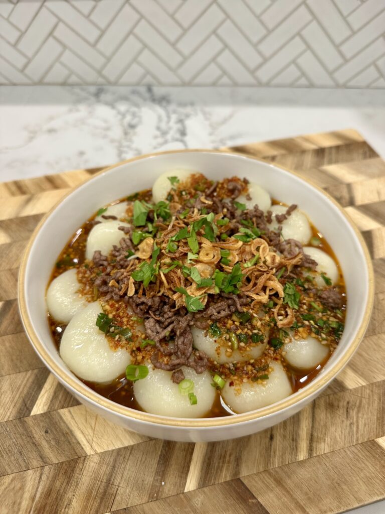 Minced beef adds richness, depth, and a protein aspect, to balance the chewy noodles. Cooked until deeply savory, the beef brings a meaty contrast that pairs beautifully with the soft, bouncy dough. It fills the center of the noodle donut and mixes into the chili oil sauce, creating a dish that feels comforting, bold, and incredibly satisfying.