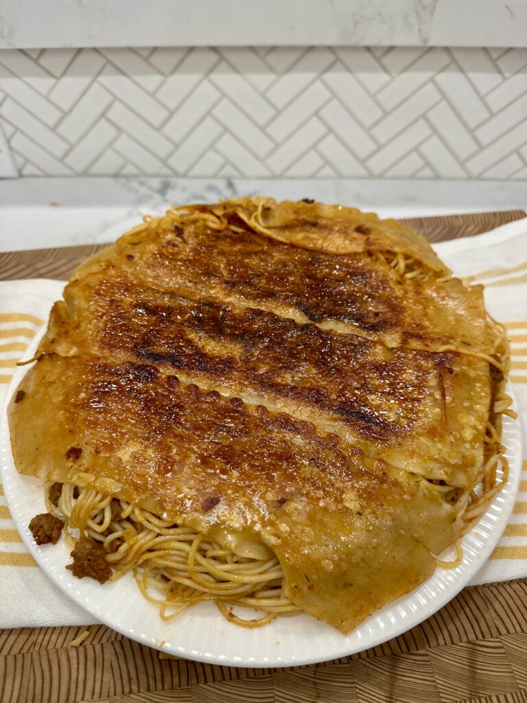 One of the most satisfying moments of making Persian spaghetti makaroni is the flip. Carefully inverting the pot onto a platter to reveal the tahdig never gets old. The golden lasagna sheets release in one dramatic piece, crackling as they hit the plate. It is equal parts nerve wracking and exciting, and when it comes out perfectly intact, it feels like a small kitchen victory worth celebrating. Even if it breaks slightly, it disappears just as fast.